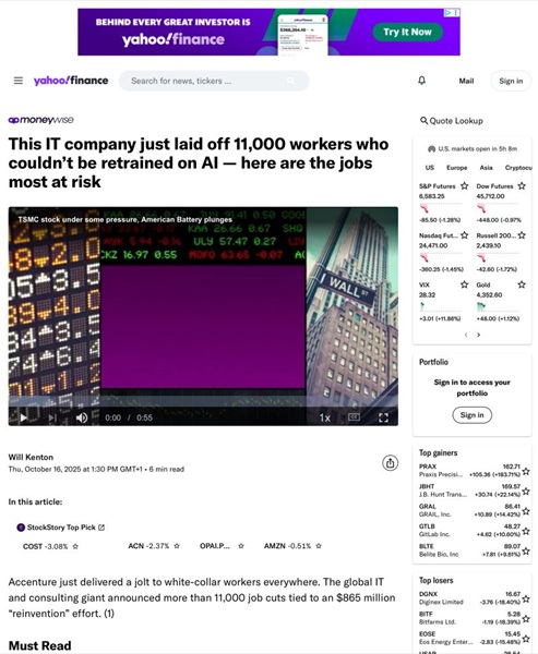 “Executives said a share of employees would be “exited” because they simply could not be retrained fast enough for AI-heavy roles. . . Accenture just delivered a jolt to white-collar workers everywhere. The global IT and consulting giant announced more than 11,000 job cuts tied to an $865 million “reinvention” effort.”