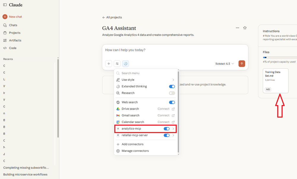 A GA4 Assistant is a dedicated Claude project configured to work as a personal Google Analytics 4 analyst. Think of it like a Custom ChatGPT, but specifically built for analytics.