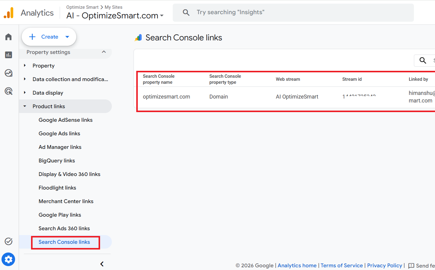 Step-11: Navigate to the Admin area of your GA4 Property, then go to Product Links > Search Console links. You should now see your search console property listed: