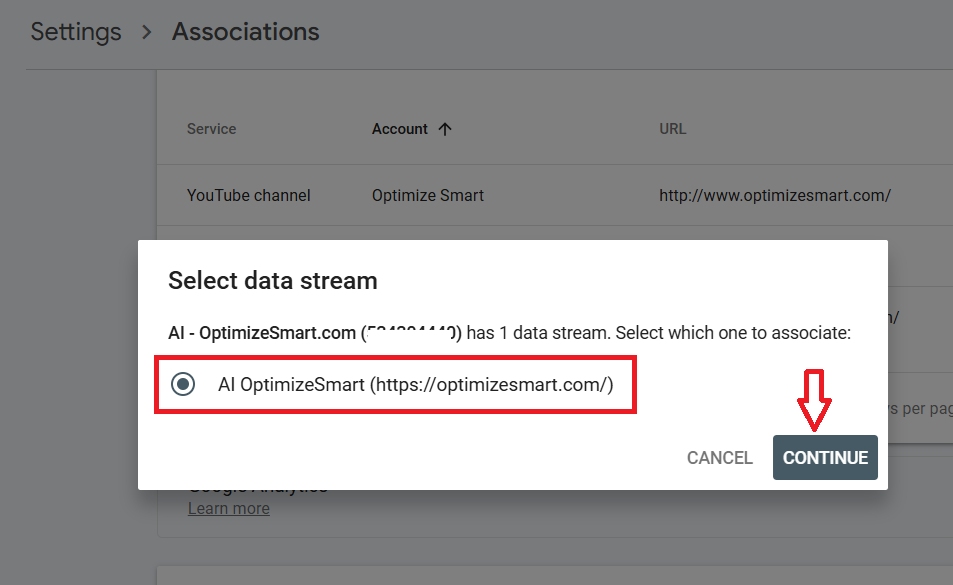 Step-8: Select the Google Analytics property you want to associate with your search console property and then click on the ‘Continue’ button: