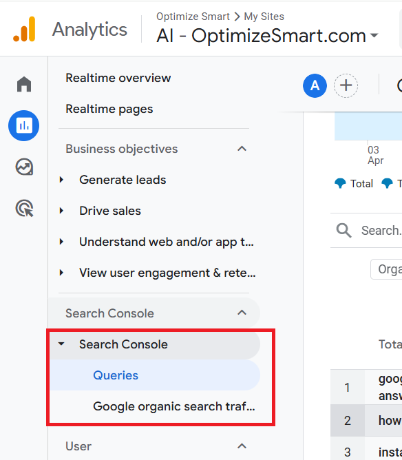Step-3: Navigate to the ‘Search Console’ drop-down menu. You should now see the following two reports: Queries and Google Organic Search Traffic: