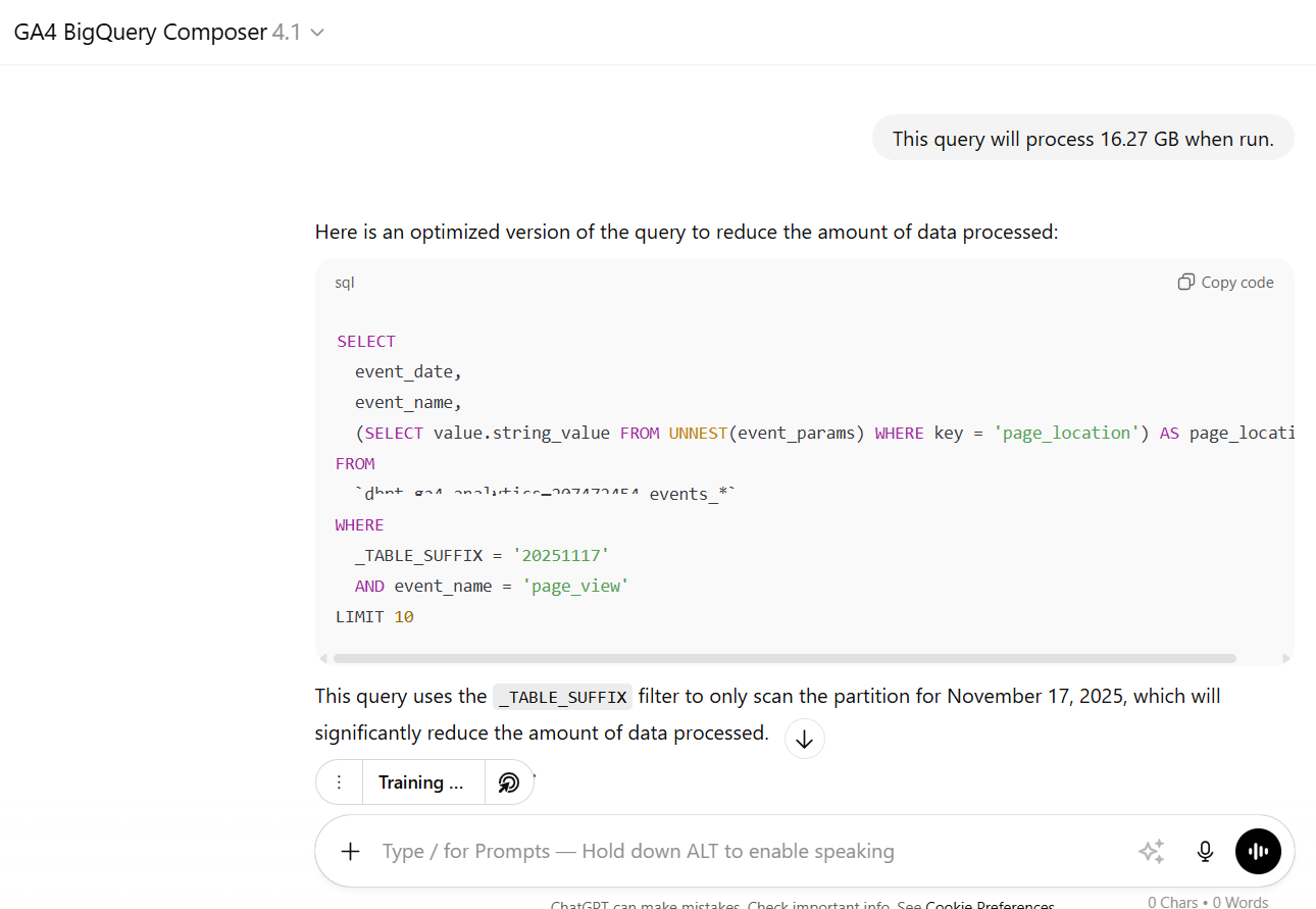 Because of these reasons, whenever I start a new session, I first use a training prompt that "primes" each ChatGPT session to strictly follow BigQuery SQL best practices while optimising queries for accuracy, speed, and efficiency.