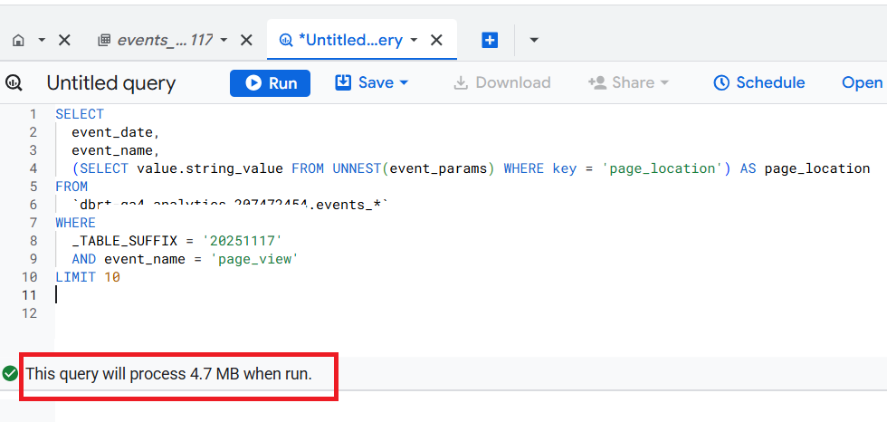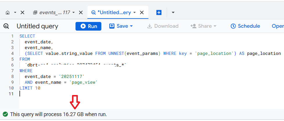 Copy the message ‘This query will process 16.27 GB when run.’ to chatGPT, and it will automatically optimise the SQL for speed and efficiency: