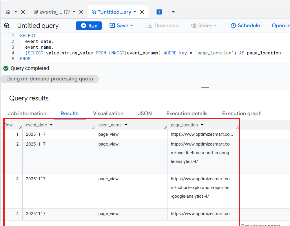 You just created a meaningful report in BigQuery, where you can see the list of web pages which got views on Nov 17, 2025.