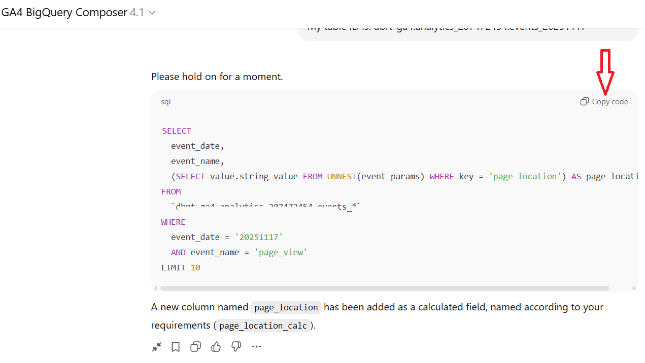 #1 You are using the GA4 BigQuery Composer Tool for the very first time with no prior history. AI models don’t always get things right the first time. You can guide AI by providing better context over multiple iterations.