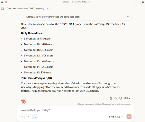 The advantage of connecting the Google Analytics MCP Server to Claude is that you can directly ask questions about your GA4 data via Claude.