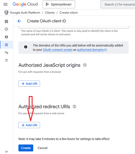 #4.5 Scroll down the screen and click on ‘+Add URI’ button below ‘Authorized redirect URIs’: