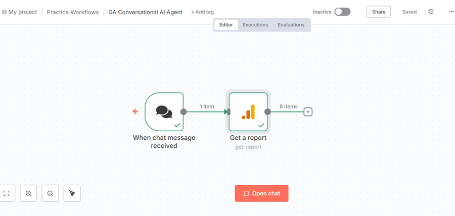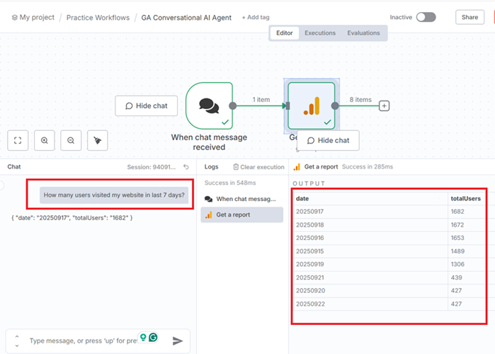 #2 The conversational AI Agent I mentioned earlier is very basic. It is unlikely to answer all of your questions. For advanced use cases, rely on the HTTP Request node to query the official Google Analytics APIs directly.
