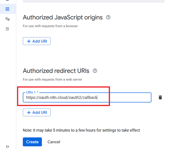 #4.9 Copy the OAuth Redirect URL provided by n8n and then paste this URL into the ‘Authorized redirect URIs’ field in the Google Cloud Console.