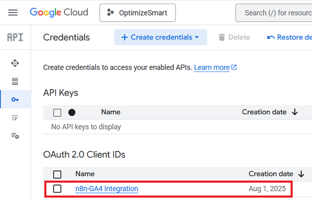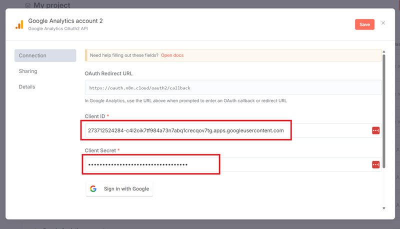 Copy the Client ID and Client Secret from the Google Cloud Console, then paste these values in the Google Analytics OAuth2 credential fields in your n8n account: