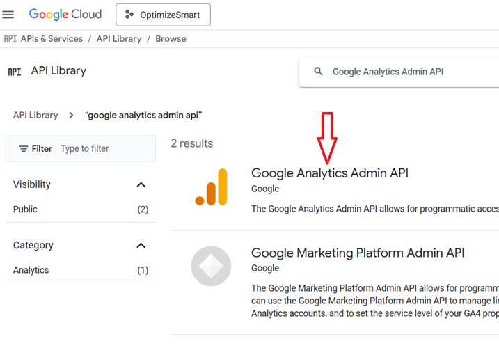#3.4 Search for "Google Analytics Admin API" (to manage accounts, properties, or user permissions), click on it and then enable it: