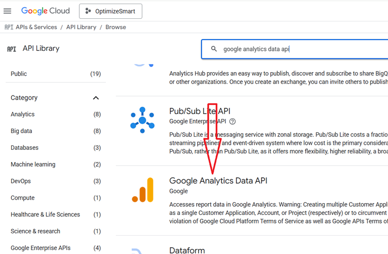 #3.3 Search for "Google Analytics Data API" (for GA4 reporting and data queries), click on it and then enable it: