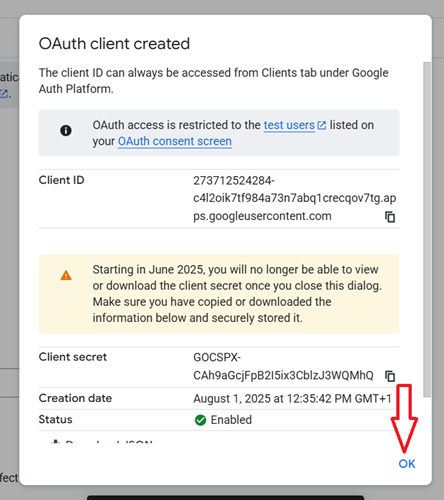 Navigate back to your Google Cloud account and click on the ‘ok’ button: