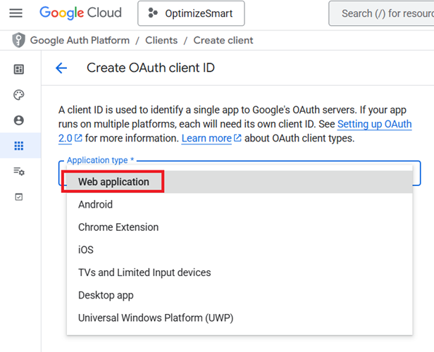 #4.3 Set Application type to ‘Web application’: