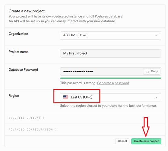 #3.3 Select the region closest to your users for the best performance, and then click on the ‘New Project’ button: