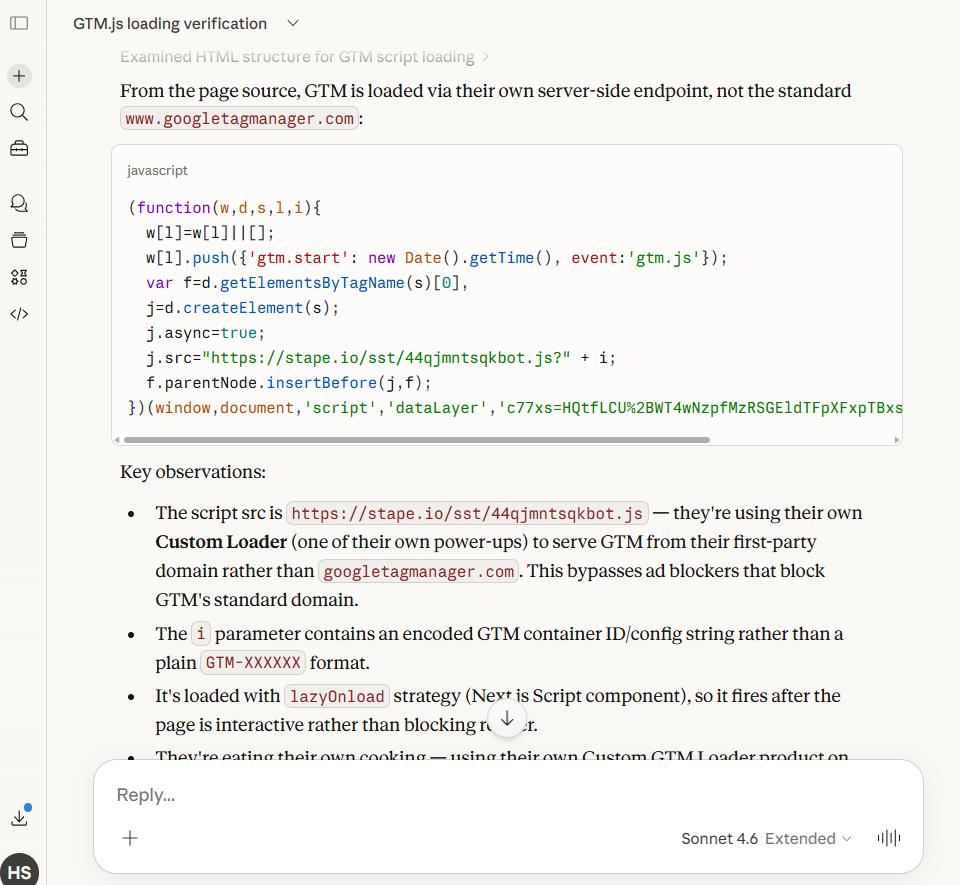 "Here is the source code of [website]. Identify any GTM or analytics implementations, including server-side proxied versions. Explain what you found and how you identified it."