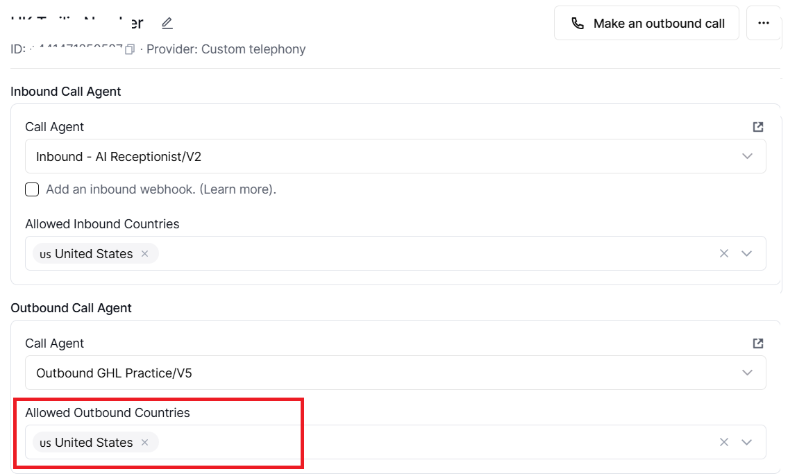 Allowed Outbound Countries on Retell AI (controlled per phone number).