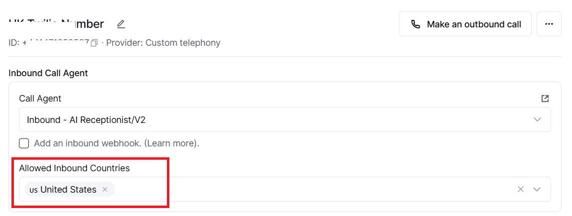Allowed Inbound Countries on Retell AI (controlled per phone number).