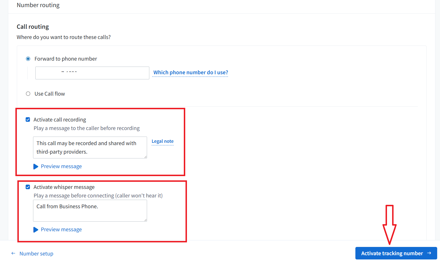 #15 Activate ‘Call Recording’ (Play a message to the caller before recording) and ‘Whisper Message’ (Play a message before connecting (caller won't hear it)), and then click on ‘Activate Tracking Number’: