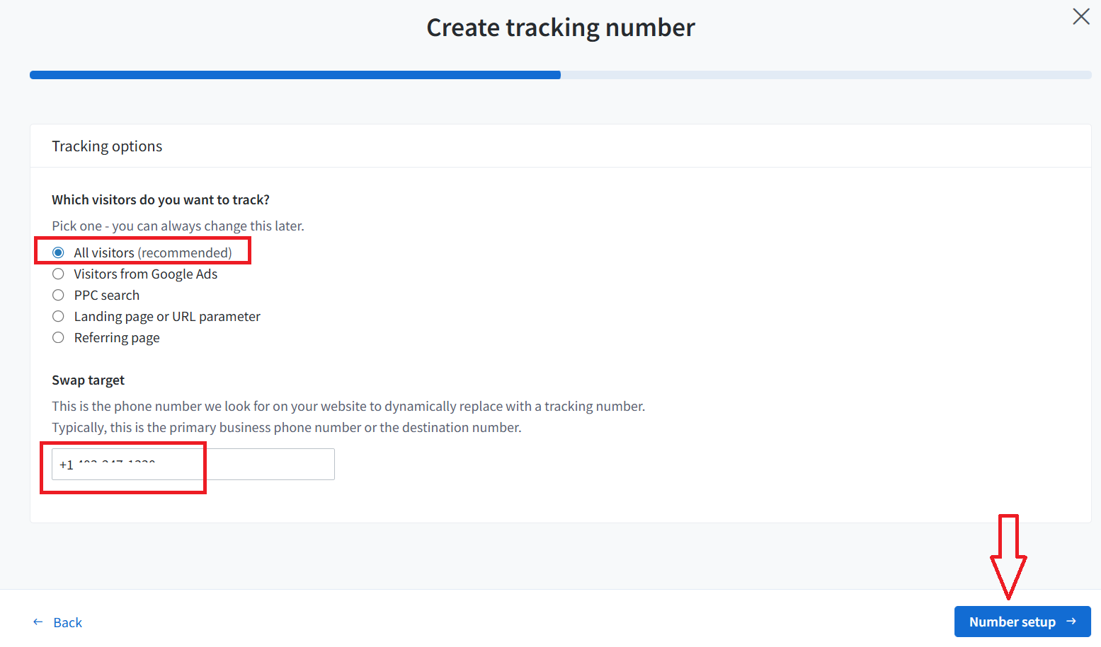 #9 Select which visitors you want to track, enter the phone number you want Call Rail to look for on your website to dynamically replace with a tracking number and then click on the ‘Number Setup’ button: