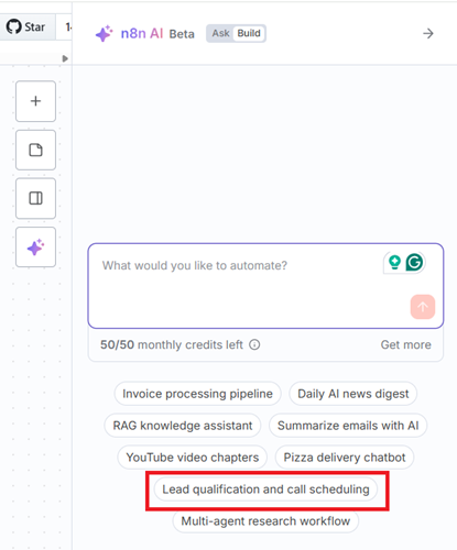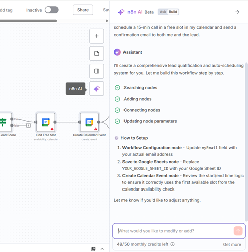 You should now see the n8n AI Chatbot with the 'Build' tab enabled: