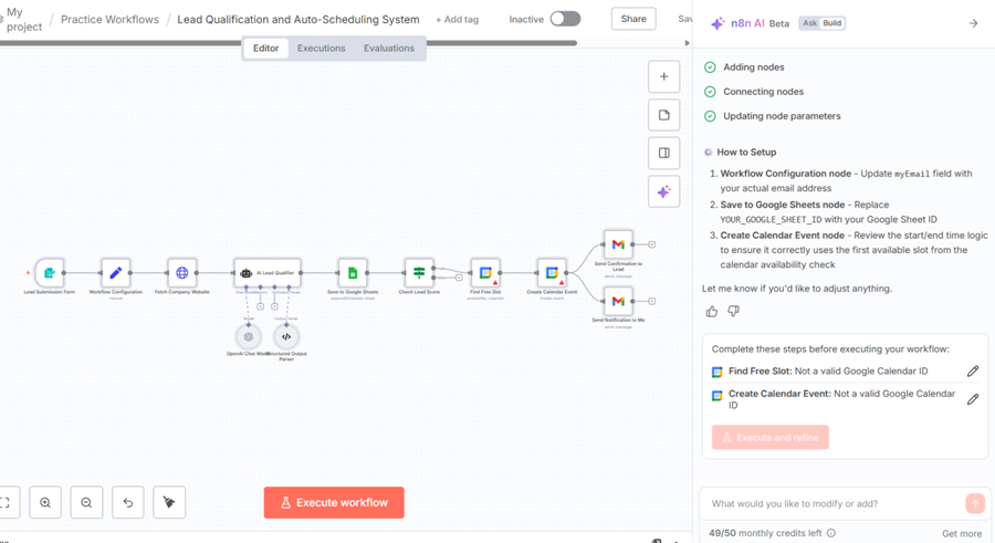 Step-6: Review required credentials/parameters and refine the workflow using prompts.