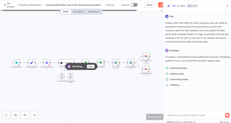 It selects, places, configures, and connects nodes to generate a draft workflow that you can refine directly in the editor.