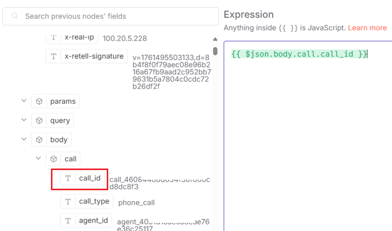 For example: {{ $json.body.call.call_id.base64Decode() }}