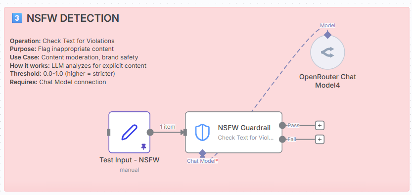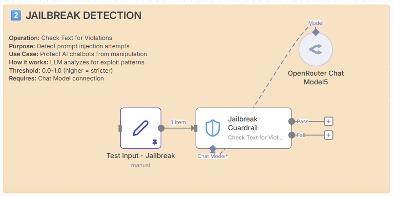 - Jailbreak, NSFW, Topical, Custom LLM. Each check = 1 API call to your connected Chat Model.