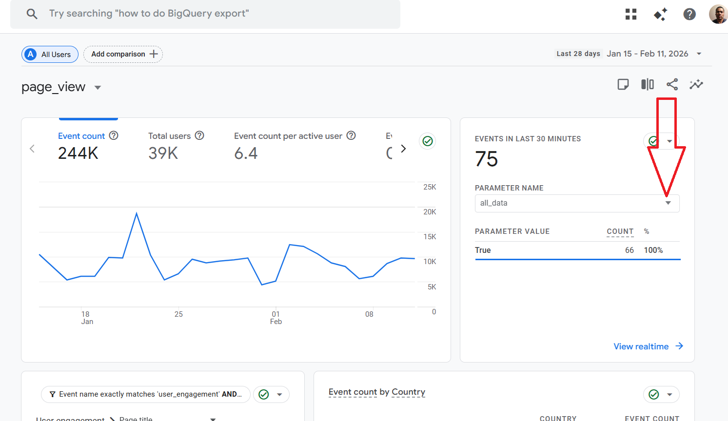 Step-3: Scroll down the ‘Events’ report and then click on an event name. Let’s click on the ‘page_view’ event: