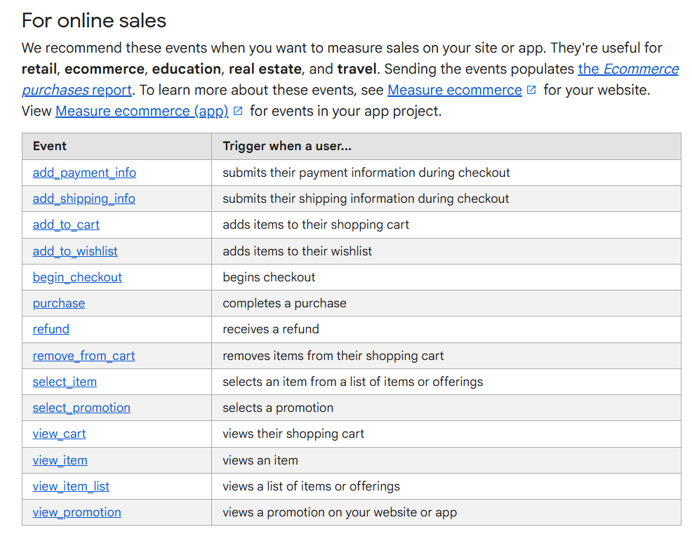 For example, Google recommends a certain set of events (also called ‘Online Sales’ events) and parameters for the Retail/ecommerce business vertical.