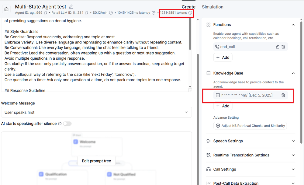 After adding the KB to the voice agent: 1231-2851 tokens and ~1425 ms latency.