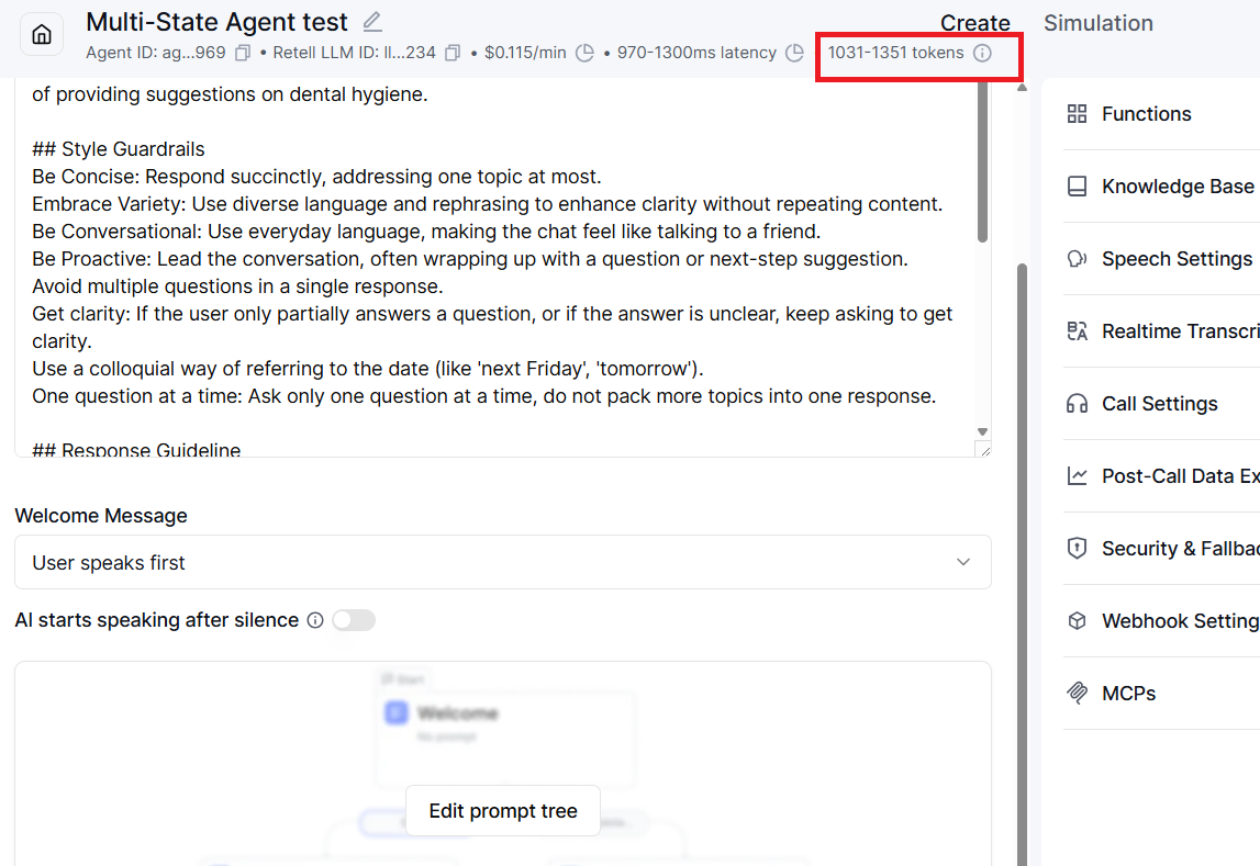 Before adding the KB to the voice agent: 1031-1351 tokens and ~1300 ms latency.