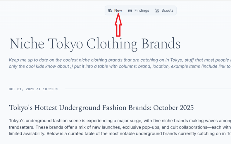 Click on a scout, say ‘Niche Tokyo Clothing Brands’ to see what it looks like.
